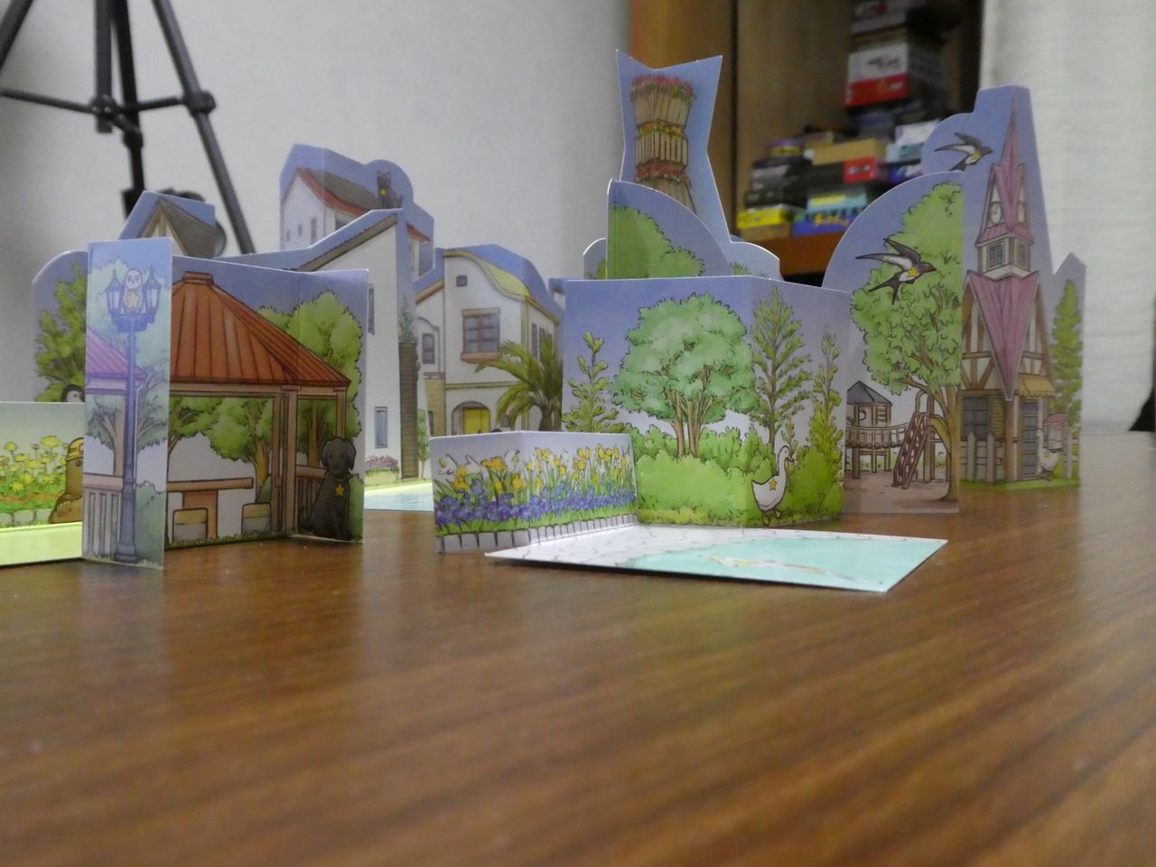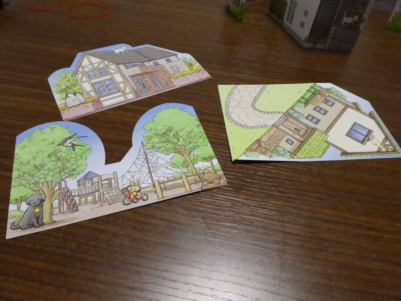 ゲームの準備は、まず建物を組み立てテーブルに一列に並べます。