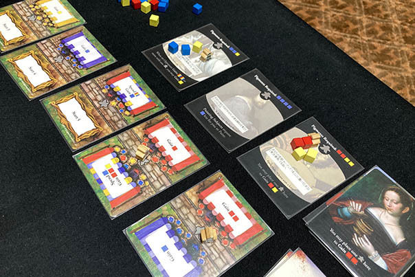 バザールカードで顔料を得て、その顔料で主題カードを得る。主題カードを6枚先取した人が勝ち。