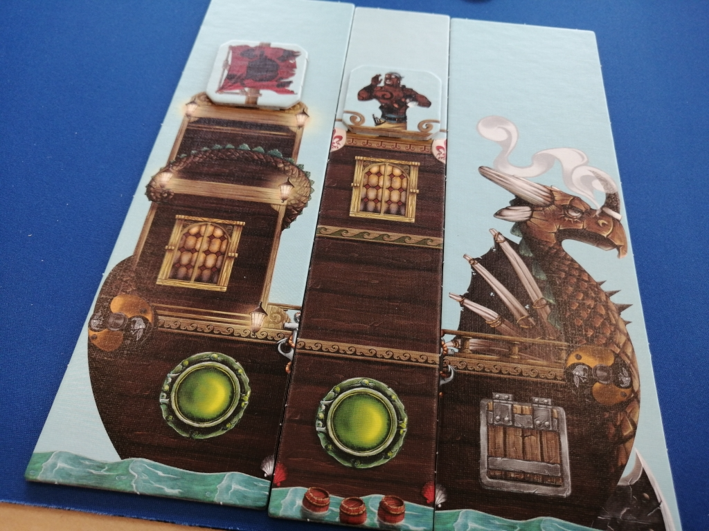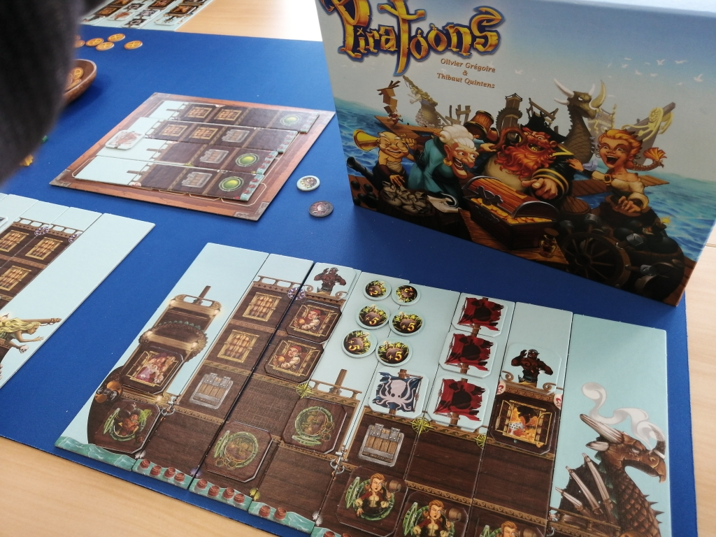 獲得できたタイルで海賊旗を大きくしたりしていくが、配置できる場所に空きマスがゲーム終了時にたくさんあるとマイナス点になるから、大きくするだけではいけません。