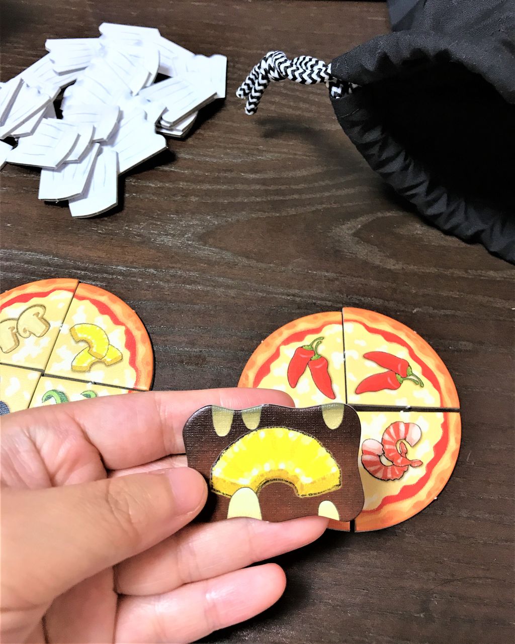最初はパイン!私はパインのピースを持っていたので、箱に返します。ピザが少し小さくなりました。2人で遊んでいるので、もうひとりもパインを持っていれば箱に返します。