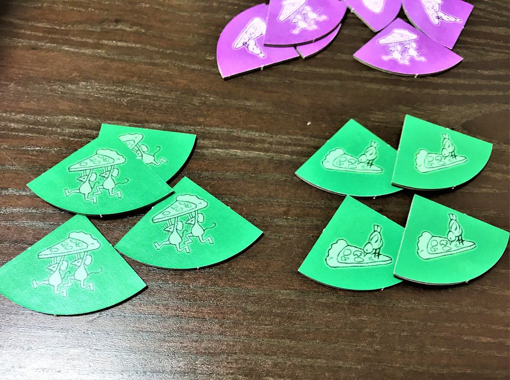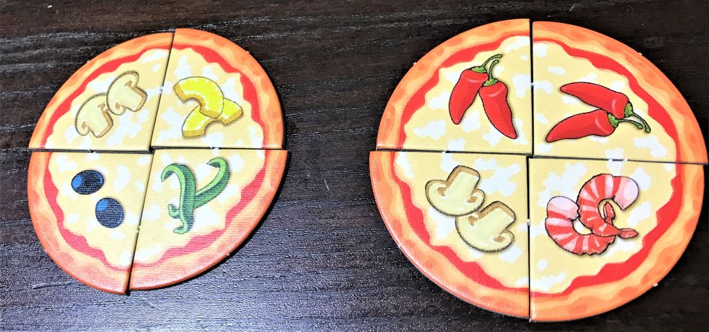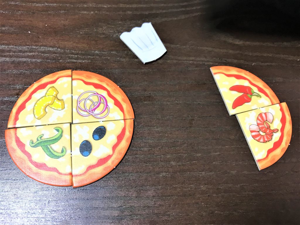 最初にピザの裏を見て、自分の色をピザを集めます。同じ絵で1枚のピザにします。