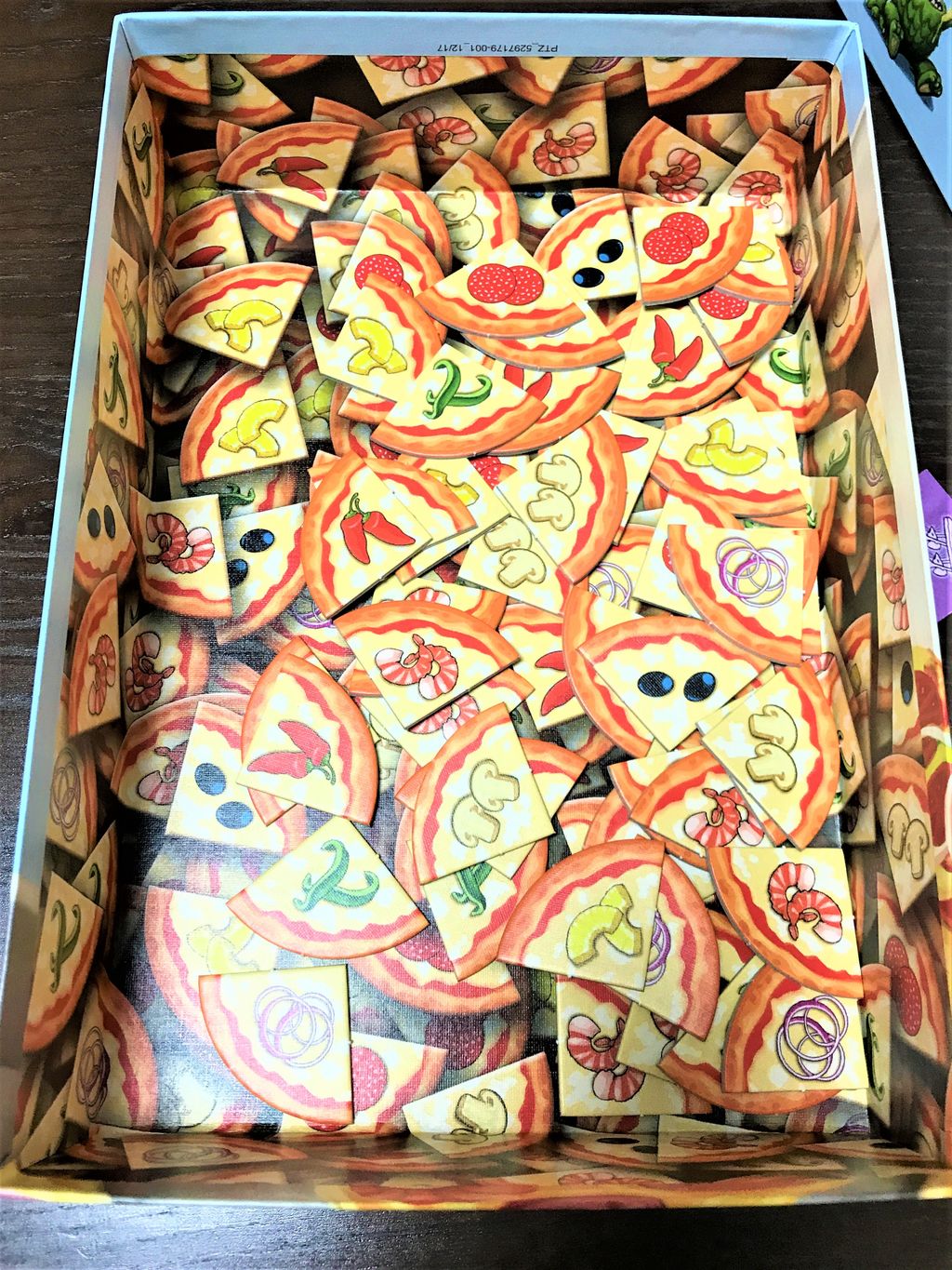 具材タイルを引いたら、対応するピザのピースを箱に入れていきます。ピザの注文が入って、モンスターに与える感じですね。
