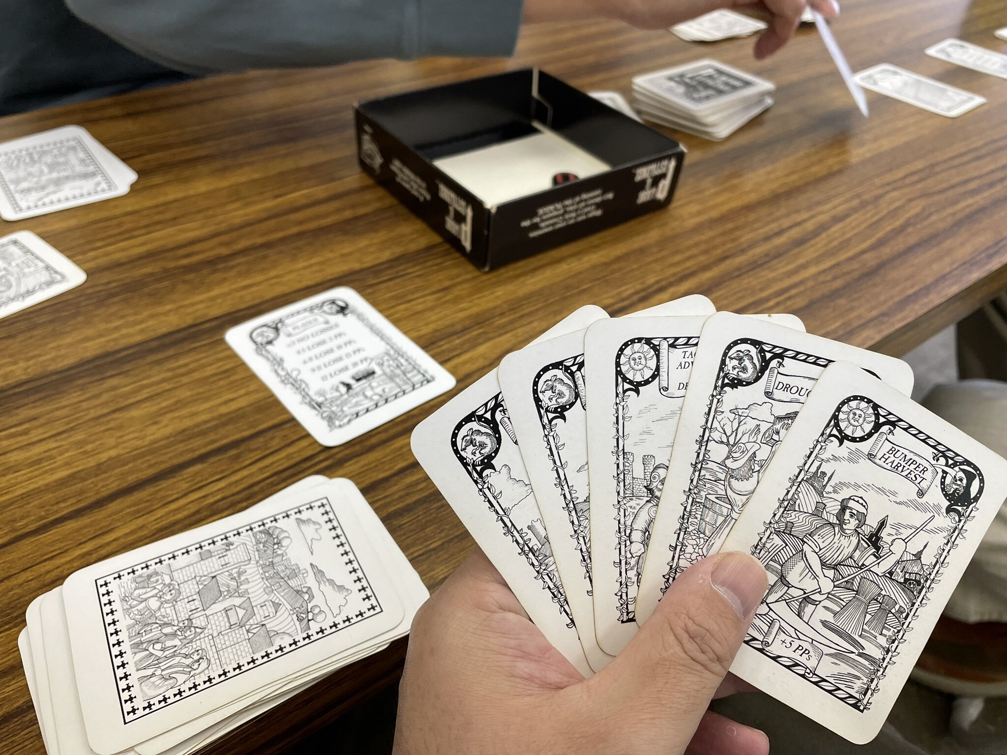 ペストと飢饉と戦争と十字軍にイラっとしてできた(意訳にもほどが)らしいカードゲームです。殴り合いしかありませんが、すぐに収束します。