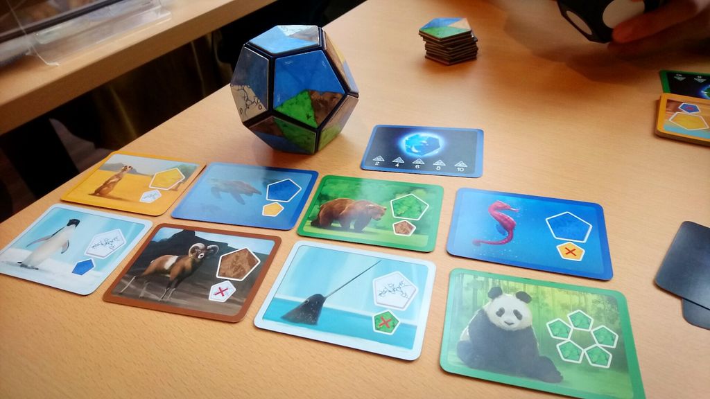そんな、楽しくて比較的簡単なゲームですが過程はとても悩ましいです。自分の目的の惑星を作りつつ、動物も呼んで加点を狙っていきます。目的の惑星と合った動物は1点(緑の惑星ならパンダやクマ、氷の惑星ならペンギンやイッカク)その他の動物は2点も入るので、タイル得点とのバランスをじっくり見ながらラウンドを進みます。どうしてもほしい動物がいても目的と合ってなければ点数が壊滅的になります。最初に遊んだときは6点をとりました。どうしてこうなった状態。
