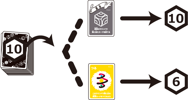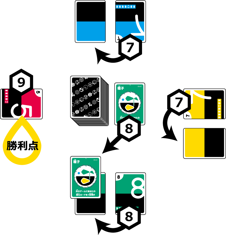 9.能力カードを取れなかったプレイヤーは、出した数字カードを表向きで自分の場に出します。この数字カードが勝利点(成長ポイント)になります。