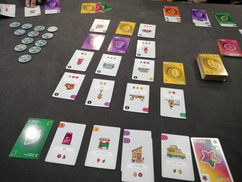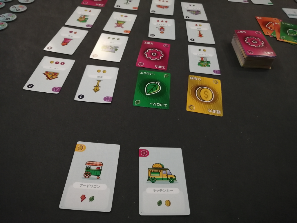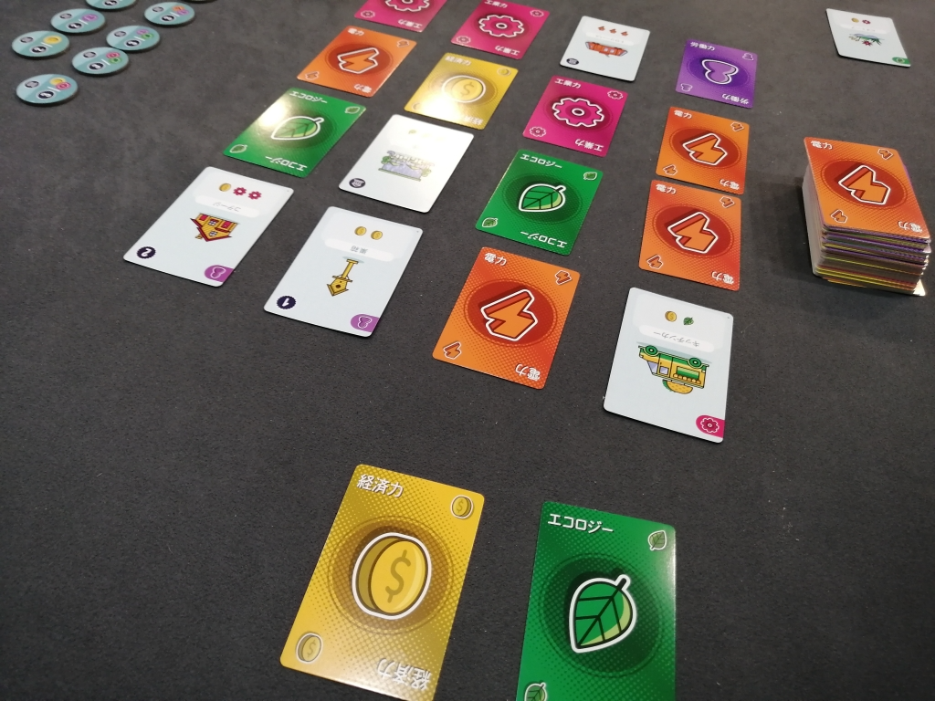 ポイントサラダとは違ってエネルギーカードを獲得したら、空いた場所には建物カードが補充されて、建物カードを獲得したら空いた場所にはエネルギーカードが補充されるかな。