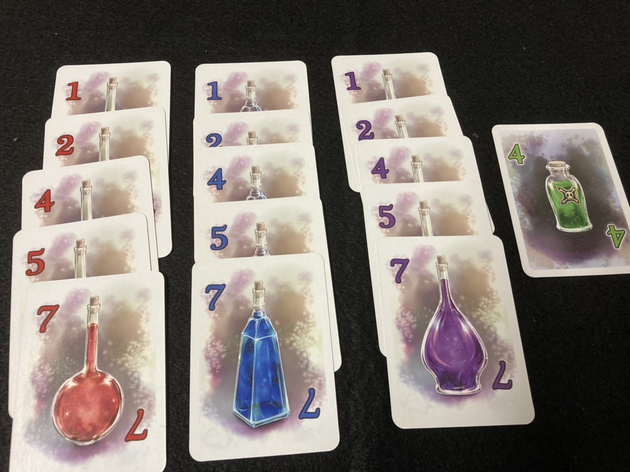 ③3色の薬には1本だけ「解毒薬」がある。という設定で、その色のカードを最もたくさん引き取ってしまった魔法使いは、特別にその薬をもらえるので、その色のペナルティだけが無しになるのです。(1本しかないっていう設定だから、同着だったらもらえないというルールにも説得力がありますね。)