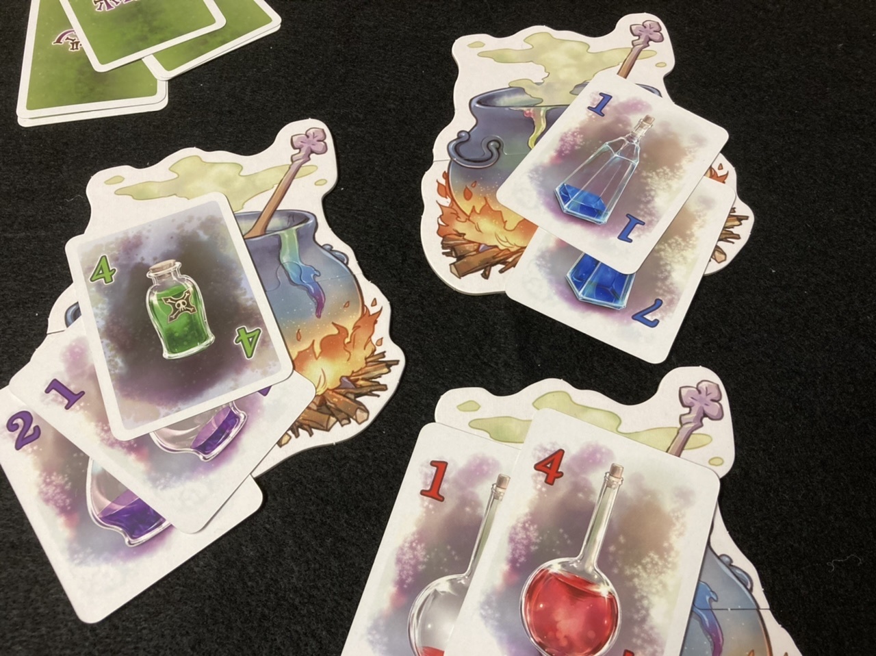 設定としては、プレイヤーは見習いの魔女になって、秘薬の調合をおこないます。そのための窯が3つあって、それぞれに材料となる薬(カード)を入れてゆくのですが、それぞれの窯には「ちょうど13」の薬しか入りません。もしあふれさせてしまったら、罰としてその窯の調合薬を飲み干さなければならないのです!