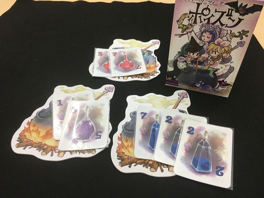 厄介なのは、毒の瓶ですね…。毒はマイナス点が2倍になるので、かなり痛いです。正直、このカードをたくさん持っているプレイヤーは強いです!この瓶はどの色にも入れることが出来るので、他のプレイヤーを邪魔することが出来ます。もちろん、入れた毒を自分が受け取ることもありますが…。