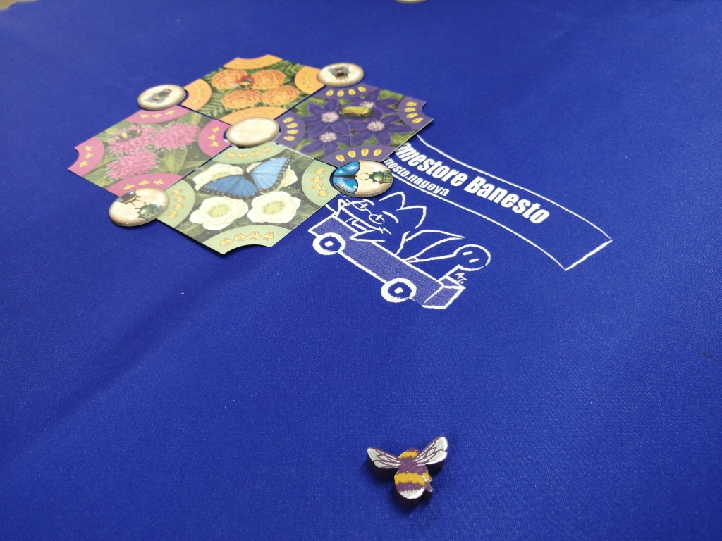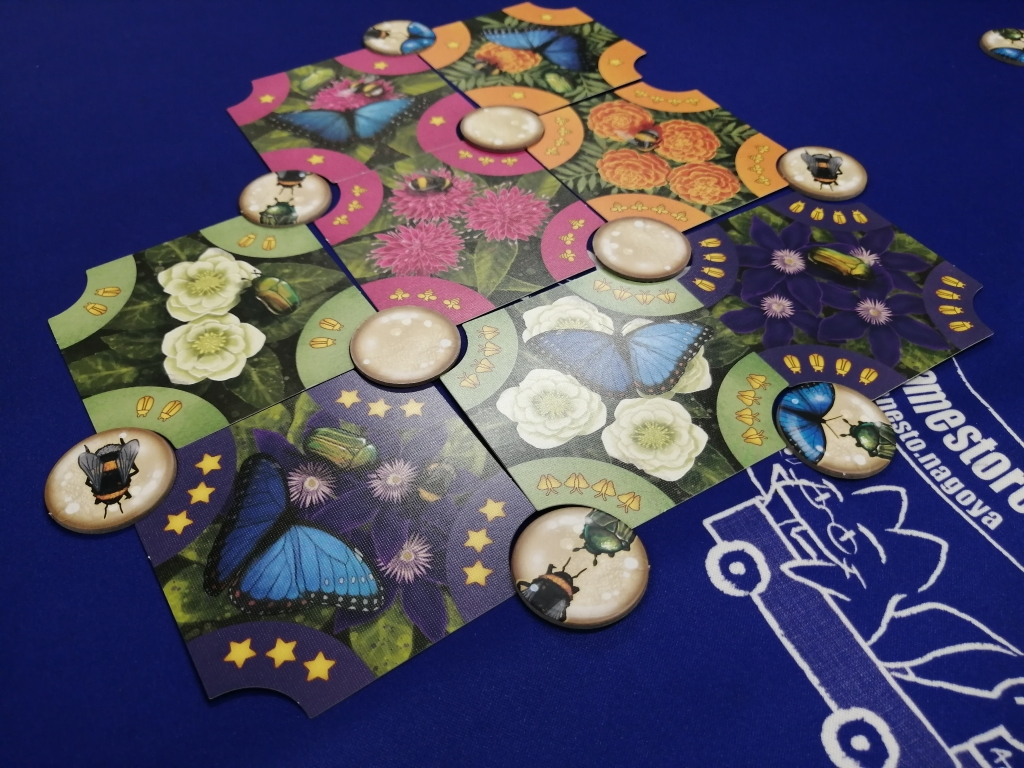 手番では他のカードに隣接するようにカードを配置し、他プレイヤーのカードと隣接して虫チップが配置されていないならチップが配置されます。