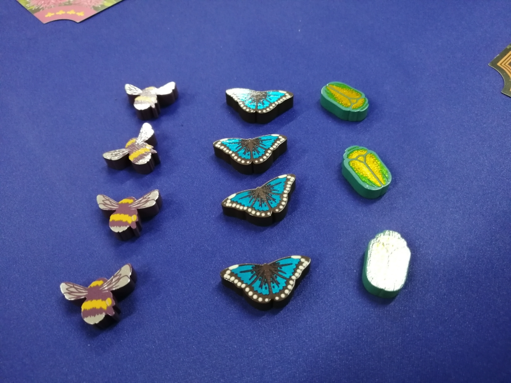 チップがカード4枚に囲まれたらマジョリティの確認をして、種類ごとに1番多くのアイコンで囲んでいるプレイヤーが虫トークンを獲得します。同点なら獲得できません。