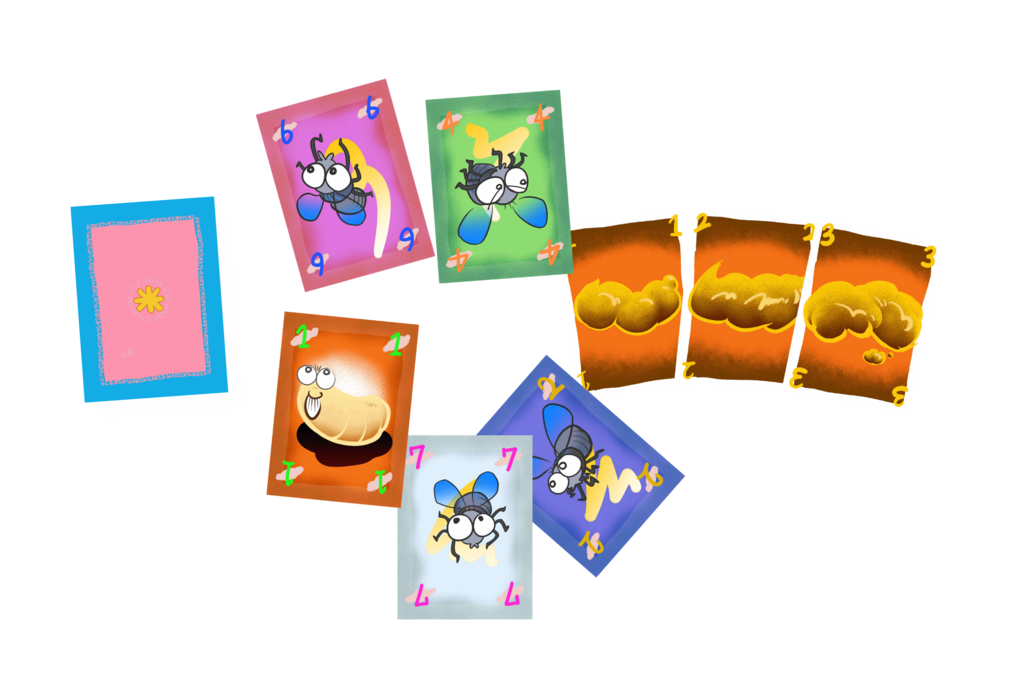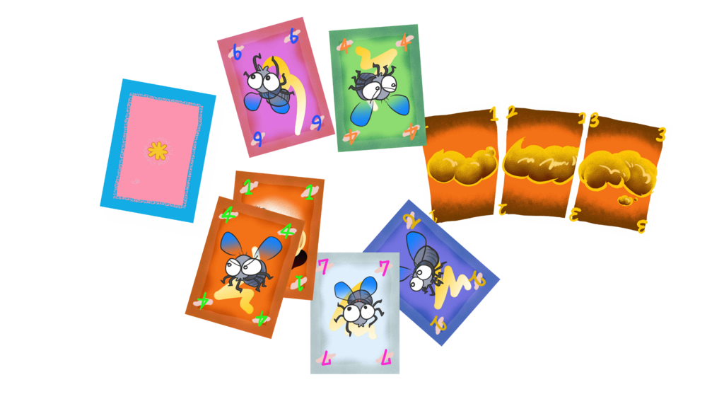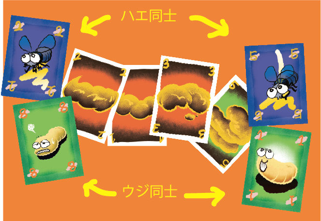 『うんちばさみ』は、自分たちがハエとウジになって大好物のうんちを取りあうゲームです☆うんちにはそれぞれ得点が書いてあり、その合計があなたの得点になります。ゲーム終了時、一番多くのうんち(の合計得点)を取っていたプレイヤーの勝利です。