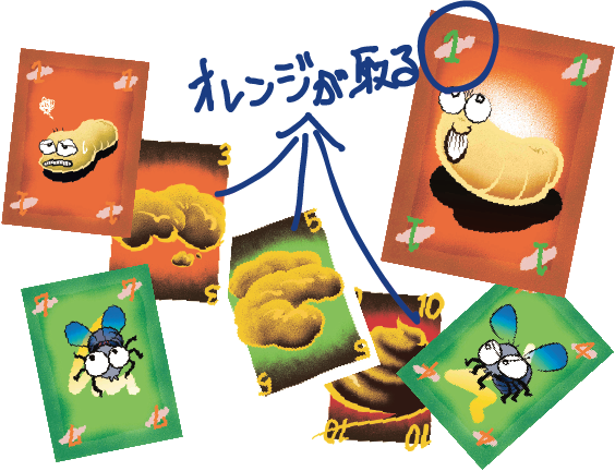 強制的な競りでは、1枚目のカードの数字で競りを行います。1枚目の数字が1番大きい者が、うんちを全て引き取ります。この場合でも、数字が同じだった場合(バッティング)は次に大きな数字の者が取ります。ただし、全てのプレイヤーがバッティングしていた場合、うんちは残したままハエとウジだけ流して再び5枚までうんちをめくっていきます(前述:バッティングのルールと同様)