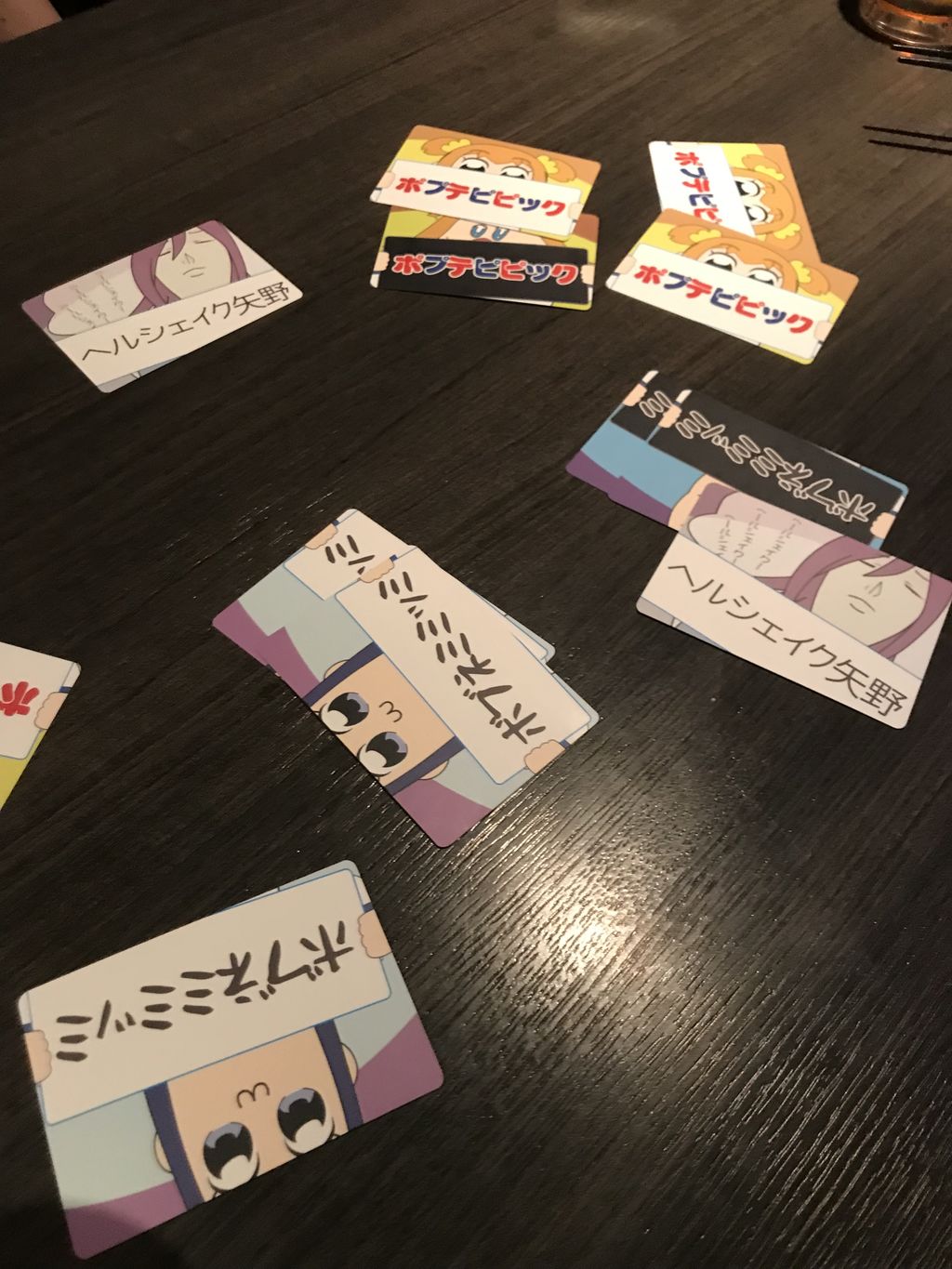 なんだかんだで、自分の額のカードが「ポプデピピック」「ボブデミミッミ」机の上で予想した方に額のカードを置きます。ちなみにそうすることゲームから抜けて喋ることができなくなります。