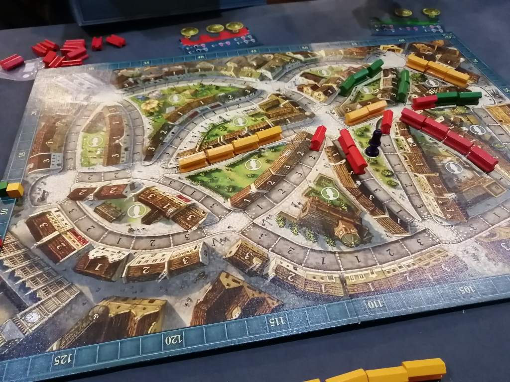 手番では2〜4のアクションマーカーを使用して、アクション数だけ路面店を建てるか客を呼ぶかをします。客が路面店を挟むと決算となり、路面店の数字合計×客による組み合わせ倍率だけ得点を獲得します。通りごとにある路面店は埋まっていないと得点ができなくて、今回は1か所やらかして20点ぐらいは損しました。