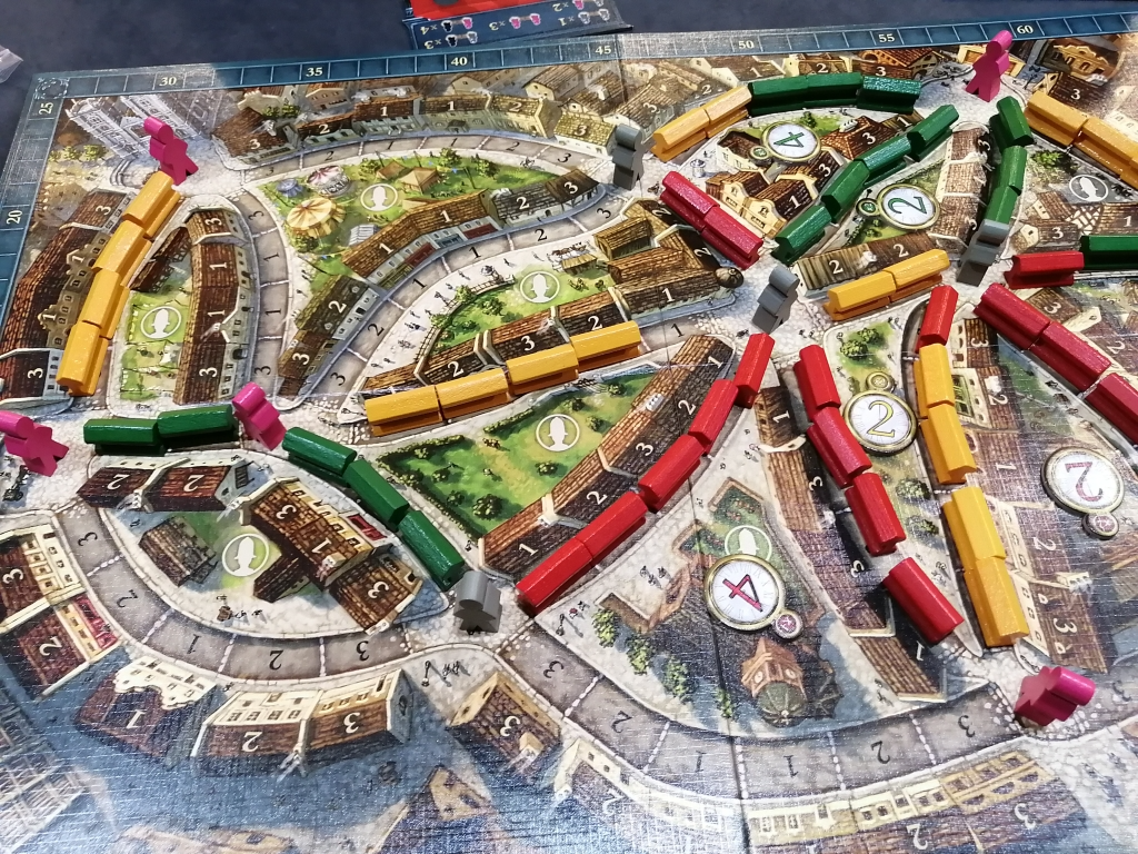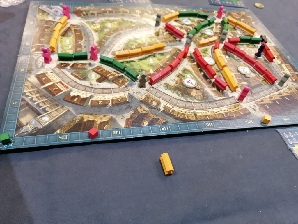 ゲームは誰かが所持路面店をすべて配置したら手番を一緒にして終了し、得点が高いプレイヤーの勝ちになります。