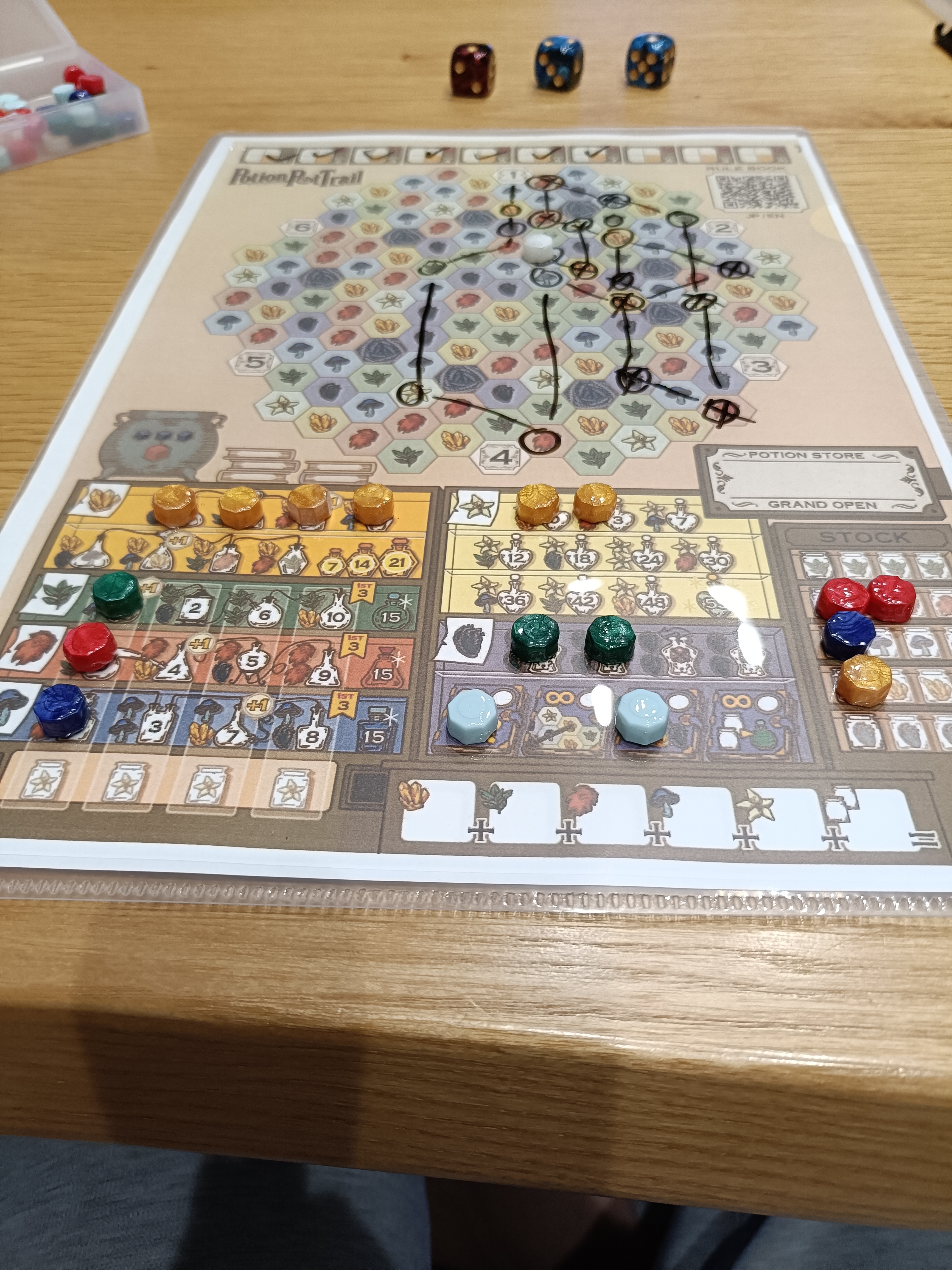 何がイイって、これコンビニのエンタメプリントで買えます。ローソンでゲットしてクリアファイルに入れて遊んでます。ペンで書き込むのもいいけど、自作のトークンでボードゲーム感アップ。ポーションが出来ていくとトークンでいっぱいになり嬉しい。