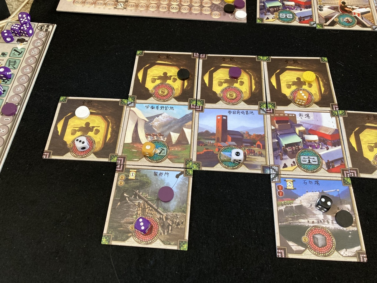 ちなみに毎回《長城タイル》という大きな得点源タイルが1枚ずつ公開され、誰かが取るか、誰も取らなかったらターン更新時に流されていきます。全部で14枚あるのですが、これが尽きると『最終ターン』なので、どうやっても最大15ターンで終わります。なので、特に収束性が悪いというわけではないですが、これがおきるとやっぱりボード展開が少々地味になる印象はありますね。