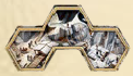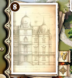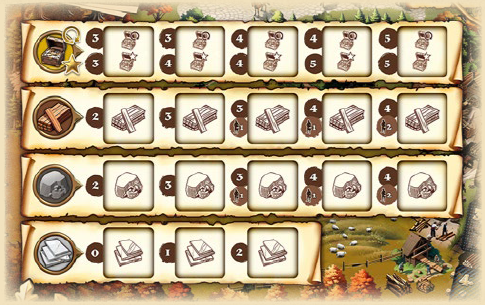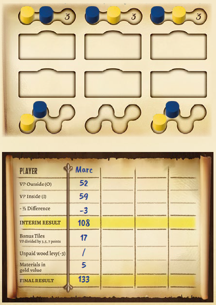訳注: プレイヤーは職人と資源を使って、自分の城に建物を増築し、屋内と屋外に装飾を施します。屋内と屋外でそれぞれ勝利ポイントは別になっており、最終的に屋内と屋外がほぼ等しく、どちらも高いことが望ましい状態です。