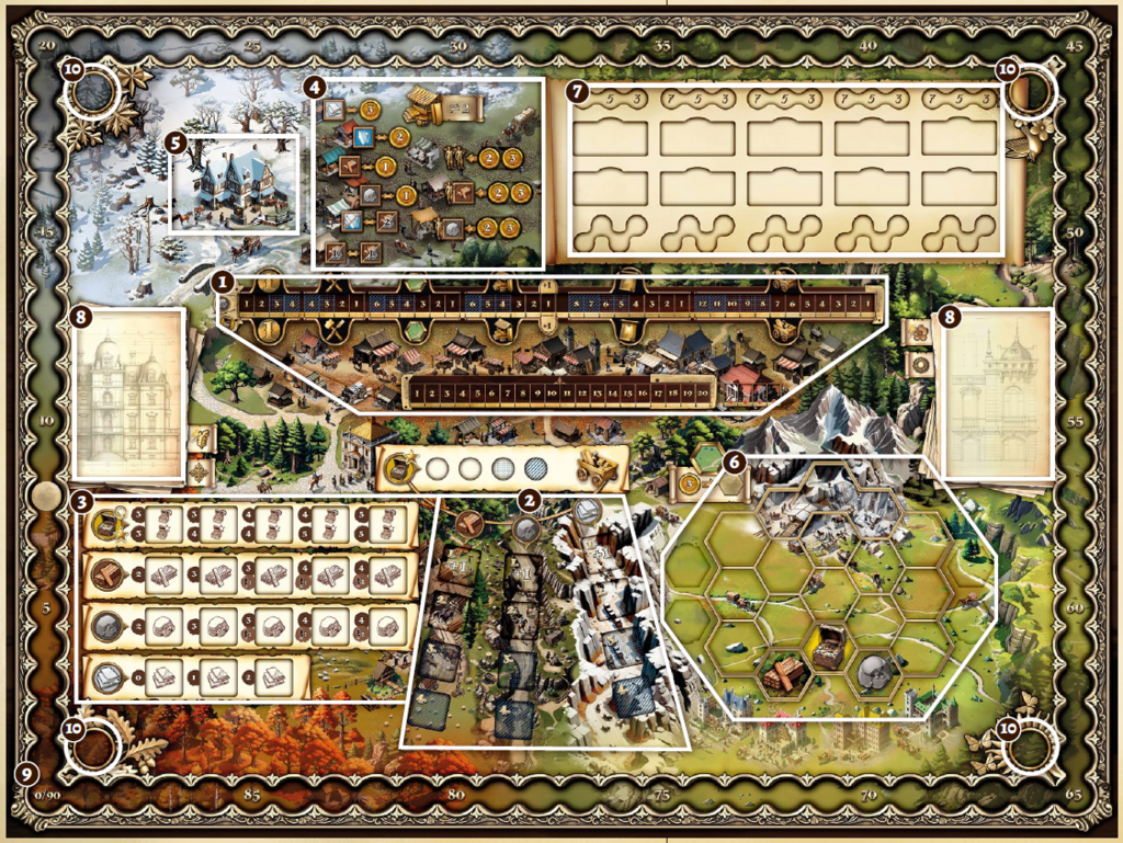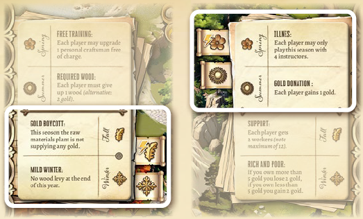 このワーカープレイスメントゲームは、4シーズンで1年、3年間にわたって行われます。シーズンは建設や資源の調達に影響を与える可能性があります。このため、個々の行動を慎重に計画し、他のプレイヤーを注意深く監視することが非常に重要です。