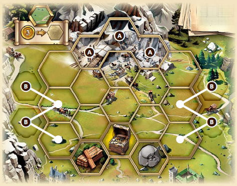 8) イベントカードをシャッフルし、マークされた2つのスペースに3枚ずつのカードを裏向きに置きます。残りのイベントカードは見ないまま箱に戻します。
