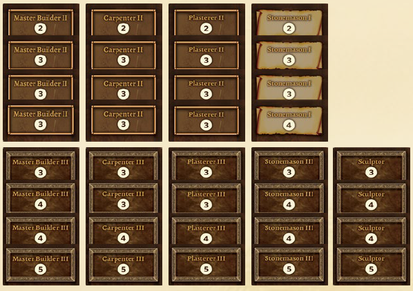 4) 各プレイヤーは、(建築士I、II、III、大工 I、II、III、左官 I、II、III、石工 I、III、彫刻家I)で構成される職人注文タイルを含む職人セットを受け取ります。職人ヘッドタイルは、ステップ6で一般ディスプレイに配置されます。