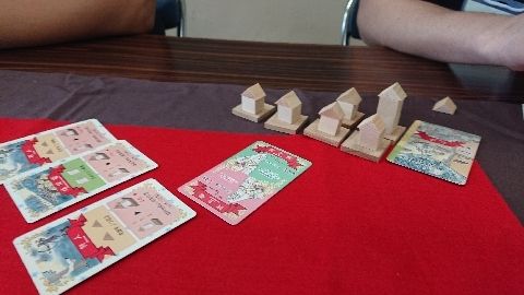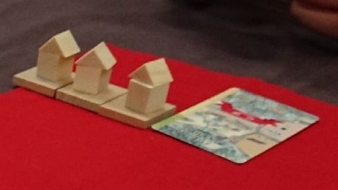 【2ラウンド目】 赤 エル2世 毛皮をソリで木材に変換して依然、資材を増やす中、 黄 コータツ公 わざとカードを捨てて、アクションチップを得る行動に! アグレッシブな動きです。 青 スハーマ公 修道院でカードを2枚引きして、木材を得るなどこちらも資材を増やします。