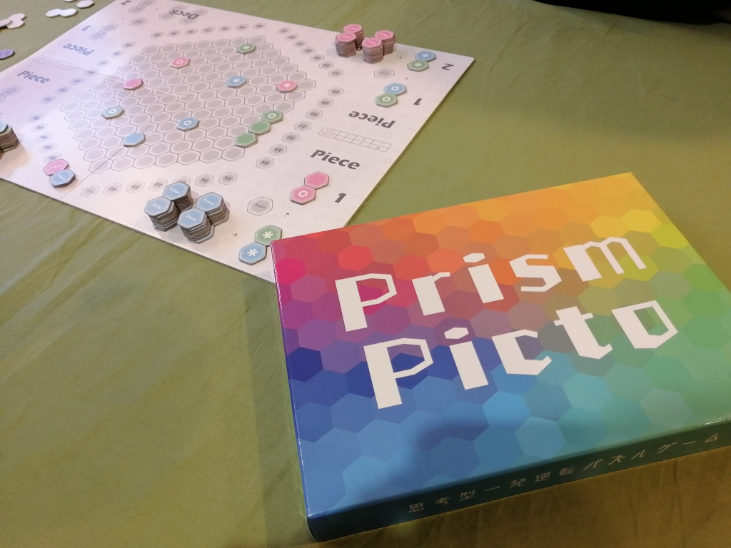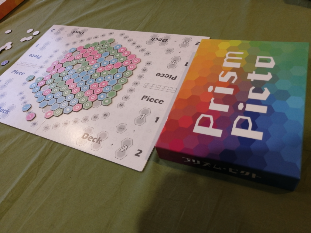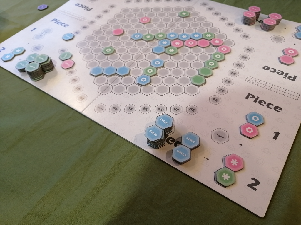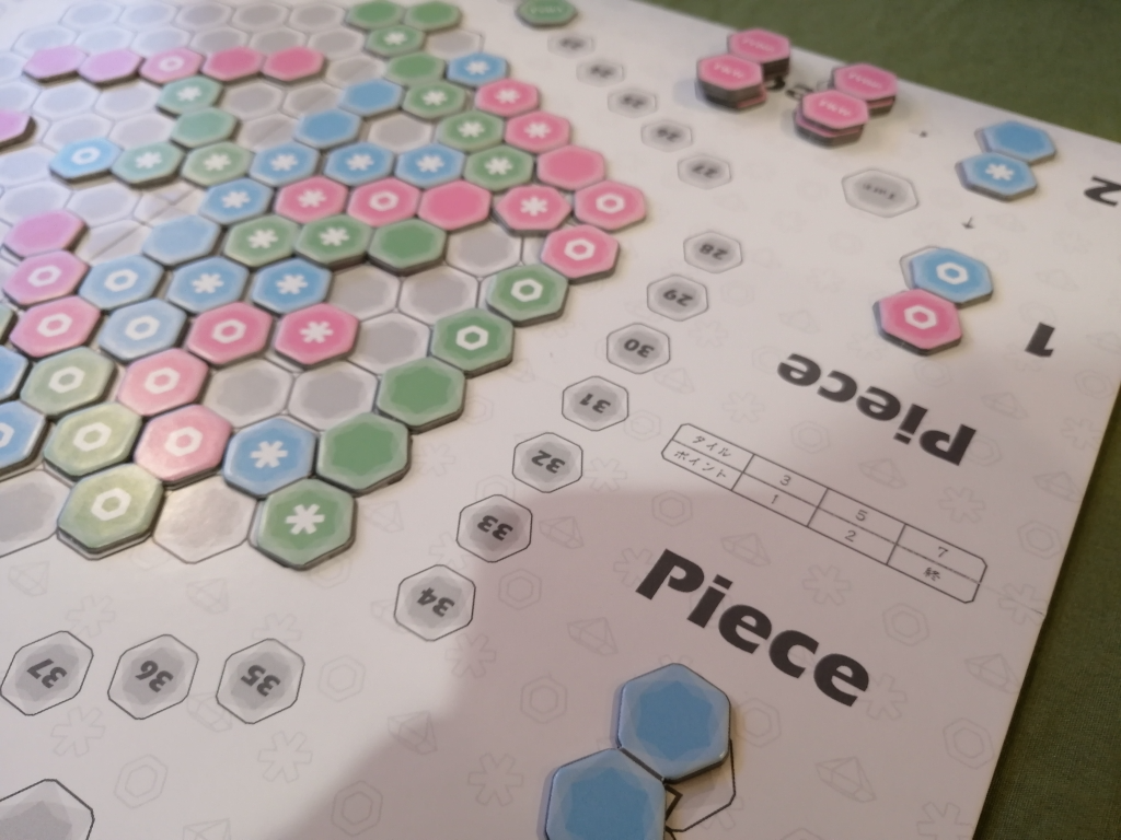 3人専用のタイル配置ゲームで、配置した際に同じ色やマークが連続して3個以上繋がった際には得点を獲得。