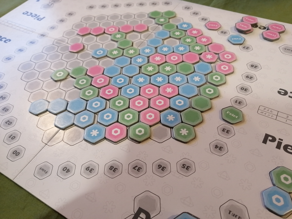 配置するタイルは、各プレイヤー公開されているのでそれを見ながら配置する。だいたいは1〜2点だが、たまに3〜5点獲得する配置をして点差を離すようにする展開。
