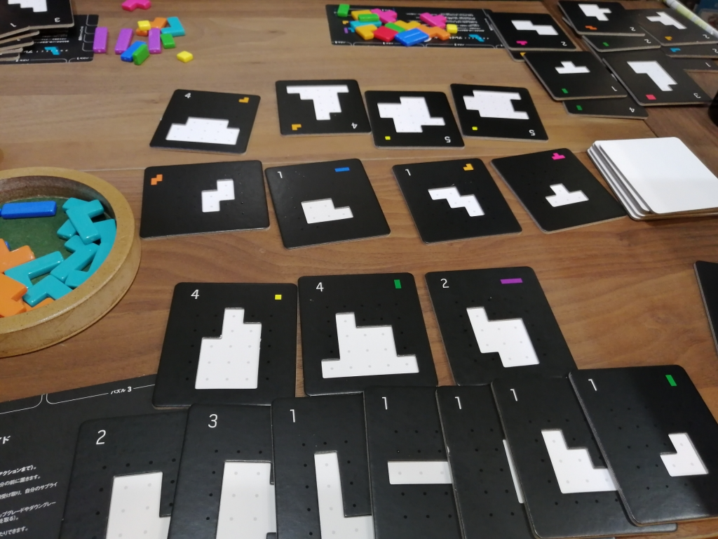 パズルのピースをタイルに配置していき、タイルが埋まると得点とボーナスタイルを獲得。手番では3アクションを実行し、ピースの獲得やピースのレベルアップ、タイルの獲得、ピースの配置とする。