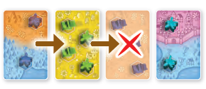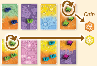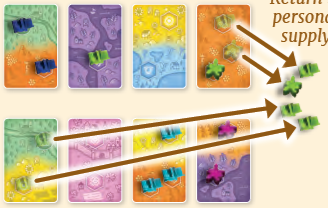 マジョリティの勝者がいる場合、勝ったプレイヤーはただちに、その行(そしてその行のみ)の地形カードからすべてのワーカービープルを回収し、プレイヤーボードの隣の個人サプライに追加します。マジョリティの勝者がアクティブプレイヤーでない場合、勝者はただちにワイルドリソースを1つ獲得でき、プレイヤーボードのリソーストラック上のワイルドリソースマーカーを1つ上に移動します!