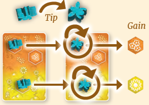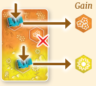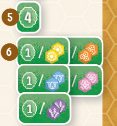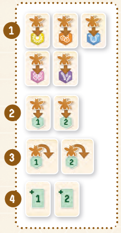 1) 建築直後に、中央サプライからあなたのワーカービープルを1つ(または2つ)獲得します。中央サプライにワーカービープルがいない場合、この報酬を獲得できません。 2) 建築直後に、ワイルド以外の任意の3つのリソースを獲得し、リソーストラックで上に移動します。ワイルドリソースはこの方法で獲得できません。 |