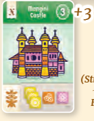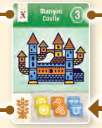 3) 永続リソース - 建物カードを建築するときに、そのリソースタイプの割引(カードによって1つまたは2つ)として使用でき、女王の宮殿を建築するときにも、そのリソースタイプとして使用することができます。それぞれは、建築ごとに1回のみ使用できます。 4) ワイルドの永続リソース - 建物を建築するときに、任意のリソースタイプの割引として使用でき、女王の宮殿を建築するときにも、任意のリソースタイプとして使用できます。それぞれは、建築ごとに1回のみ使用できます。 |