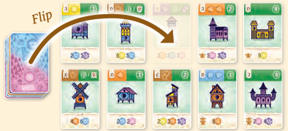 注: これらのカードは、建物面を下に(建物のイラストの面がカードの表とみなされます)、地形面を上にして(地形のイラストとリソース収集スペースの面がカードの裏と見なされます)、シャッフルする必要があります。