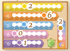 各プレイヤーは、未使用のリソースによって追加ポイントを獲得します。プレイヤーボード上の6つのリソーストラックすべてで未使用のリソースの数を合計し、その数を5で割ります(端数切り捨て)。