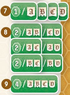 7) 該当する文字を持つギルドバナーごとに1ポイントを獲得します。 女王の宮殿カードには、任意の文字としてカウントされるワイルドギルドバナーがあります(下記の8と9にも当てはまります) 8) 該当する文字のギルドバナー2つのセットごとに2ポイントを獲得します。 9) ギルドバナー4つ(文字 A、B、C、およびD)の完全なセットごとに4ポイントを獲得します。 |