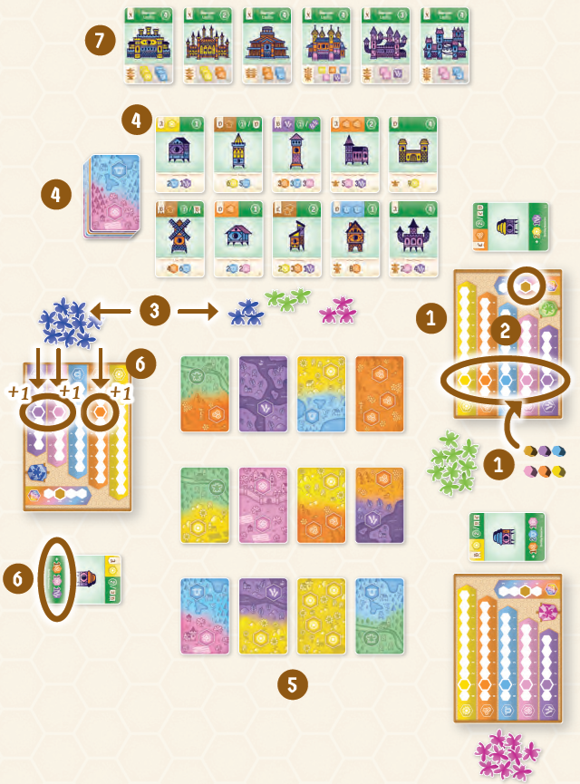 1) 各プレイヤーにプレイヤーボード、6つのユニークなリソースマーカー(各色1つ)、およびプレイヤーボードに一致する色の12のワーカービープルを渡します。