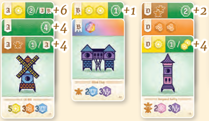 スコアリング条件の背景は緑色です。各建物カードはゲーム終了時に個別にスコアリングされる必要があります。つまり、あるカードのスコアリングに使用されたリソースやギルドバナーは、別のカードのスコアリングに使用できます。