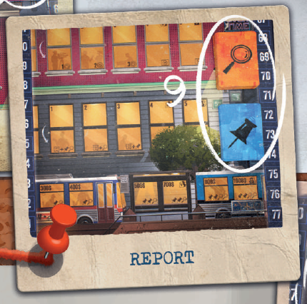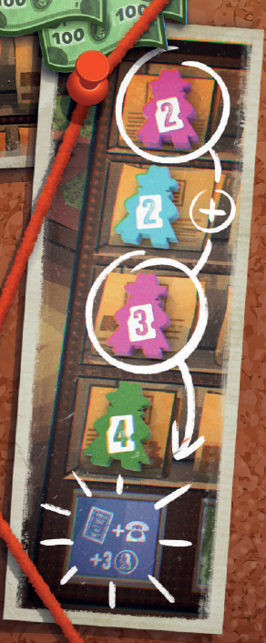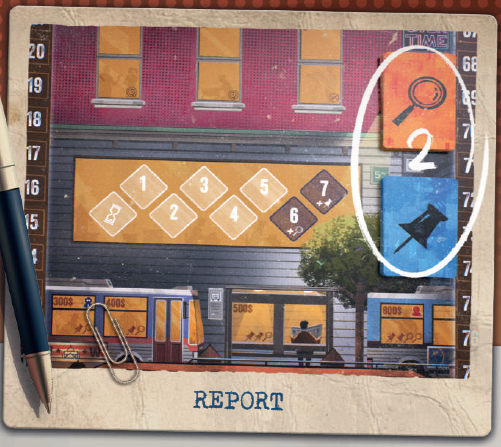 あなたのジャーナリストが占めるスペースで示された数だけ、それぞれのカード(ピン、ルーペ)を取り、証拠スペースからサポートするジャーナリストがいる場合は、対応するカードを追加で獲得します。