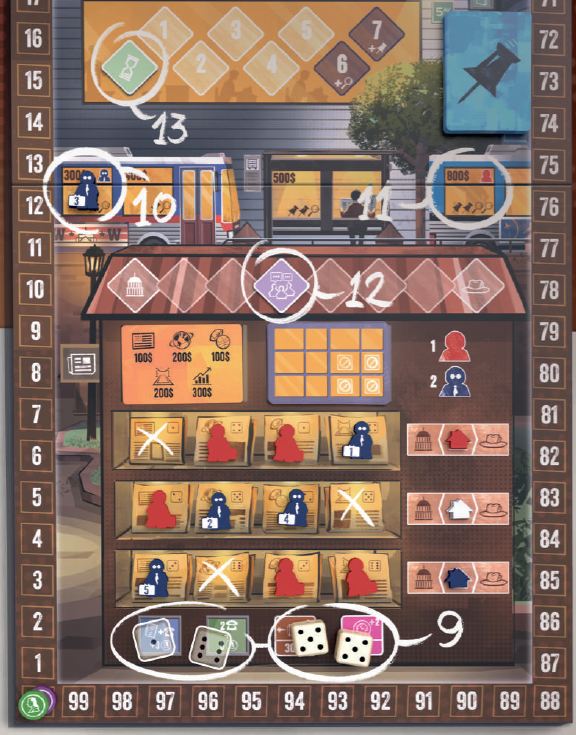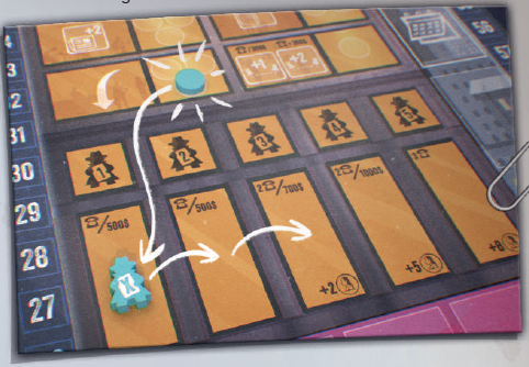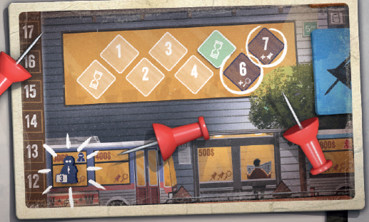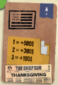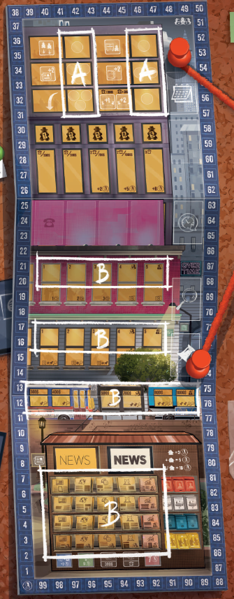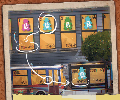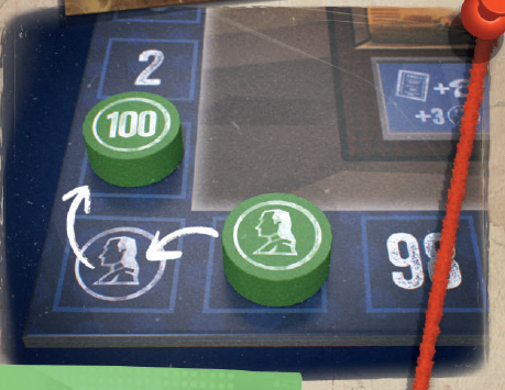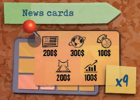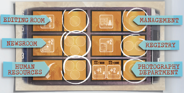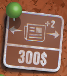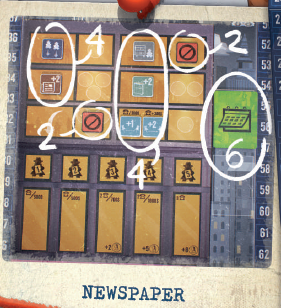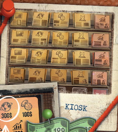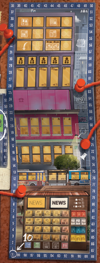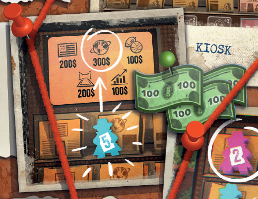 このエリアにジャーナリストを配置すると、ジャーナリストを配置した列に基づいて、ニュースカードに示されている金額の紙幣をただちに獲得できます。