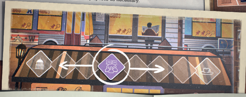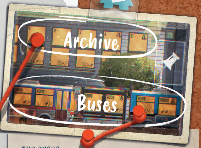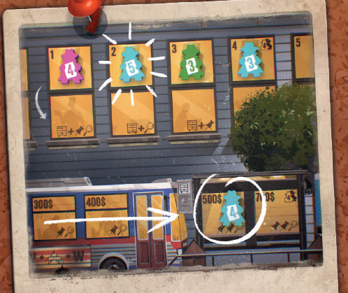 左側のバス(ワシントン行き)、バス停、右側のバス(空港行き)の3組のスペースがあります。ジャーナリストを右に配置すればするほど、より多くのカードが手に入り(スペースの下部に示されているように)、レポートを改善するチャンスが増えます。