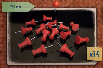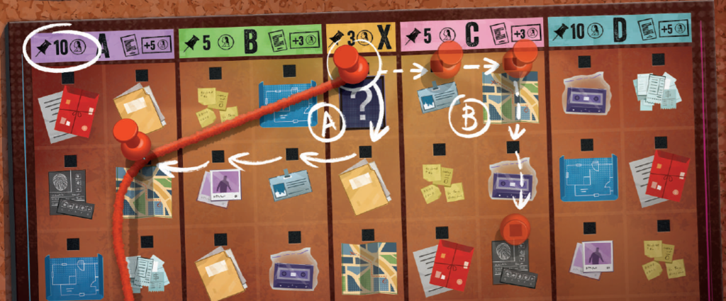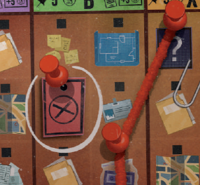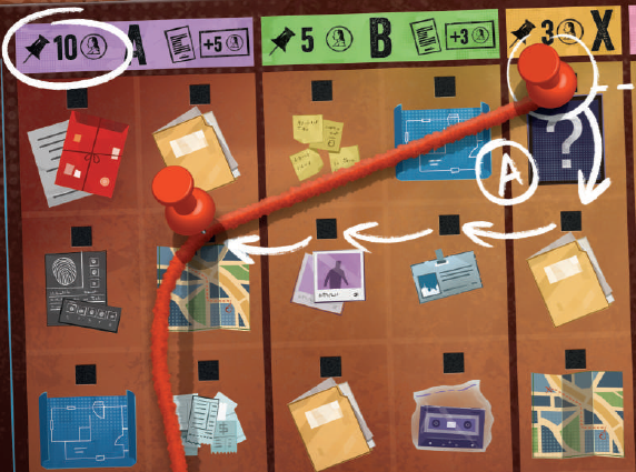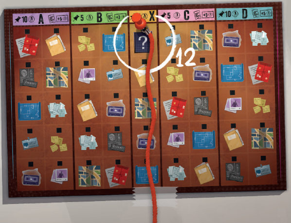 最後に、各プレイヤーは調査ボードの中央の「?」写真に紐をピン止めします(12)。 |