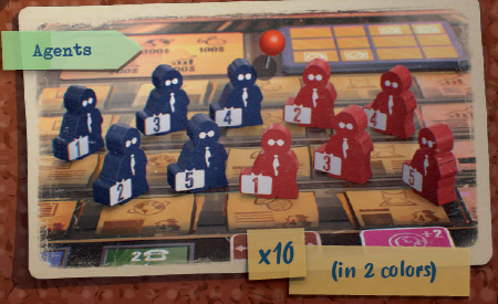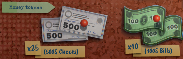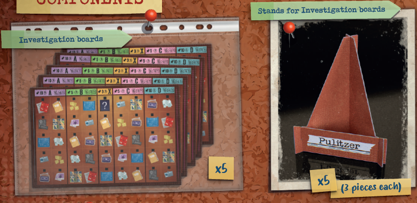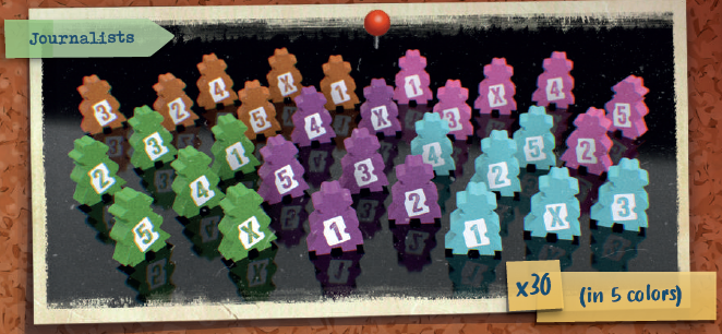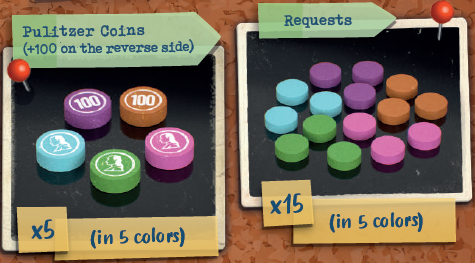 各プレイヤーは、調査ボードとそのスタンド、ピン1つ、紐1つ、100ドル紙幣が5枚、選択した色のジャーナリスト6人(値1~5とX)、丸いトークン4つ(うち1つはピューリッツァーコイン)を取ります。 |