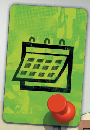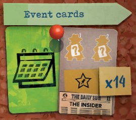 イベントカード(裏面にカレンダー)のデッキを使用してプレイするかを決めます。使用する場合は、シャッフルして指定されたエリア(新聞の右)に置きます(6)。第2ラウンドまでカードを公開しないでください。 |