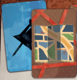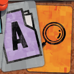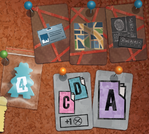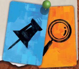 ここでは2種類のカードを受け取ります:調査ボード上の証拠に対応する証拠カード(ピン)、および調査ボード上のアルファベットと色で区別される2列(中央の1列を除く)を参照する調査ラインカード(ルーペ)です。 |