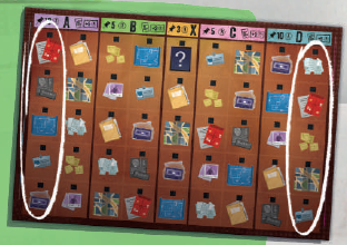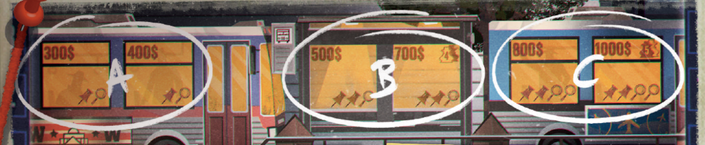 左端のバス(A)では、証拠カード1枚と調査ラインカード1枚を取ることができます。 中央のバス停(B) では、証拠カード2枚と調査ラインカード1枚を取ることができます。 右端のバス(C)では、各タイプのカードを2枚ずつ取ることができます。 |
