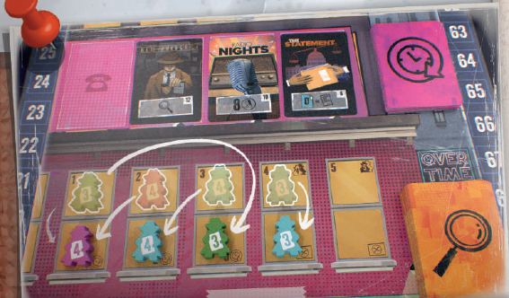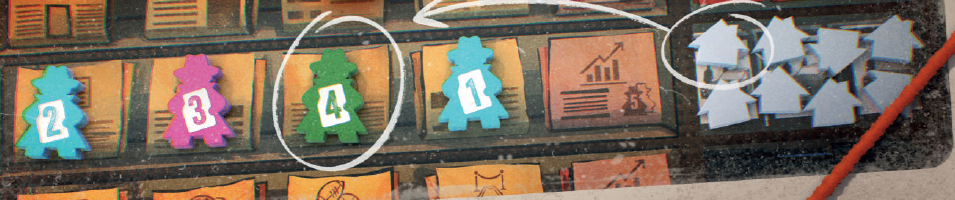 配置フェーズが終了したら、ボード上のすべてのジャーナリストをめくって、その値を公開します。エリアに関係なく、配置されたのと同じスペースのままにして、解決フェーズに進み、ボードの下(キオスク)から上(新聞)まで、各エリアを解決します。