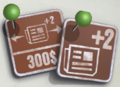 直前のラウンドで獲得したキオスク用の「+2」トークンを使用したい場合(15ページの解決:新聞を参照)、ジャーナリストを配置する時に、あなたのジャーナリストの下に「+2」トークンを配置できます。一度置いた「+2」トークンを移動させることはできません。 |