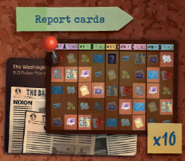 各レポートカードの裏面には、ピューリッツァー賞を受賞した実際の事件の一部と、その授与年が描かれています。 |