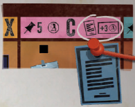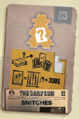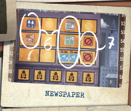 灰色の面は、新聞内の 2つのブロックトークンを配置する場所を示します。2つのブロックトークンを、新聞の、カードで示されているセクションに配置します(2)。 このラウンド中、これらのセクションは 完全にブロックされ、誰も使用できません。ライバルの先を行くために常に警戒してください。 |